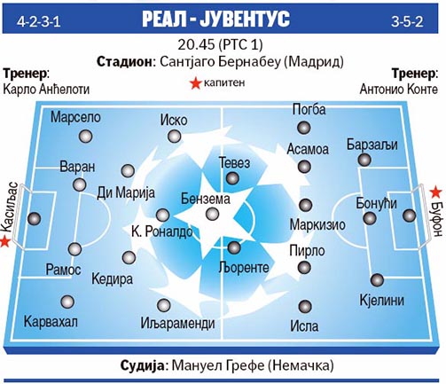 Реал, деветоструки првак Европе, угостиће вечерас двоструког шампиона Старог континента, Јувентус са жељом да прекине доминацију Старе даме у међусобним мечевима и победом обезбеди прво место у групи, док шампион Италије после лошег старта у Лиги шампиона тражи искупљење и покушаће да изненади на „Сантјаго Бернабеу” стадиону.
