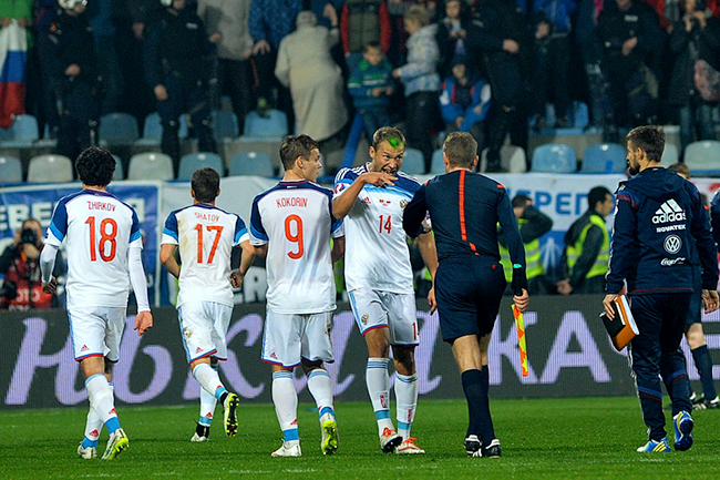 Сусрет Г квалификационе групе на стадиону у Подгорици прекинут је 27. марта већ у првом минуту пошто је руски голман Игор Акинфејев погођен са трибина бакљом у главу и морао је да буде пребачен у болницу, где су му дијагностификоване опекотине на врату и блажи потрес мозга.