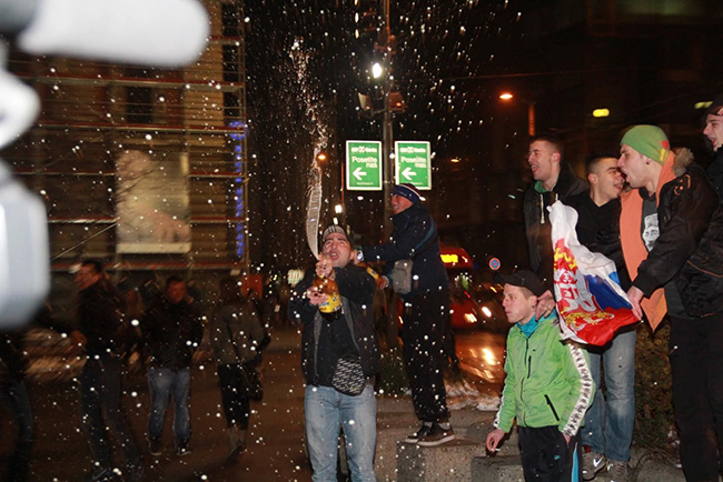 Стотине и стотине људи окупиле су се на београдском Тргу Републике, скандирајући, бацајући "топовске ударе" и гађајући грудвама саобраћајне полицајце, после вечерашње рукометне утакмице у којој је репрезентација Србије победила Хрватску резултатом 26-22 у полуфиналу Првенства Европе.