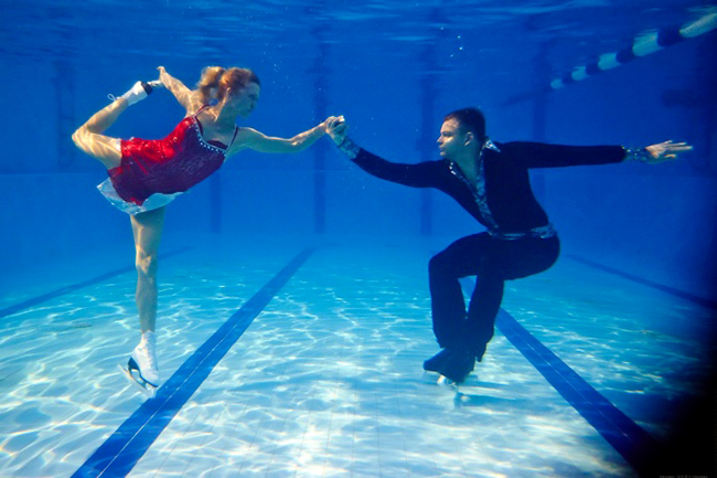 НОВОСИБИРСКИ спортисти, чланови акробатске групе Надежда Зајцева и Илија Глушков, решили су да подрже репрезентацију Русије у уметничком клизању на Олимпијским играма у Сочију и смислили су нови спорт: пар клизача изводи најсложеније акробатске фигуре под водом. Спортисти имитирају уметничко клизање, али не на леду, већ на дну базена.
