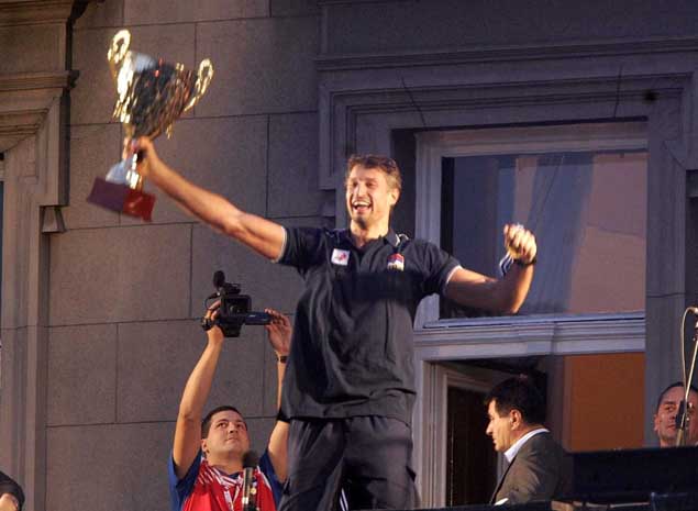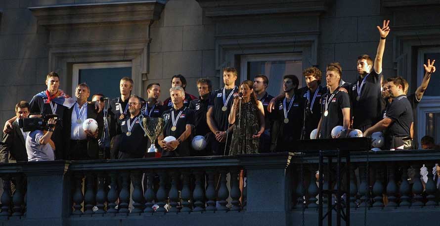 "Срећно смо играли, ово је златна медаља за целу Србију и, немојте се љутити, за Црну Гору. Ми ћемо се и даље борити, а ви будите уз нас", рекао је са балкона Старог двора Никић, играч пореклом из Црне Горе, који је окупљене "поздравио" са пар склекова.