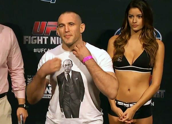 УКРАЈИНСКИ MMA-борац Алексеј Олејњик појавио се на мерењу пред мечом против Американца Џареда Рошолта у мајици са ликом Владимира Путина.