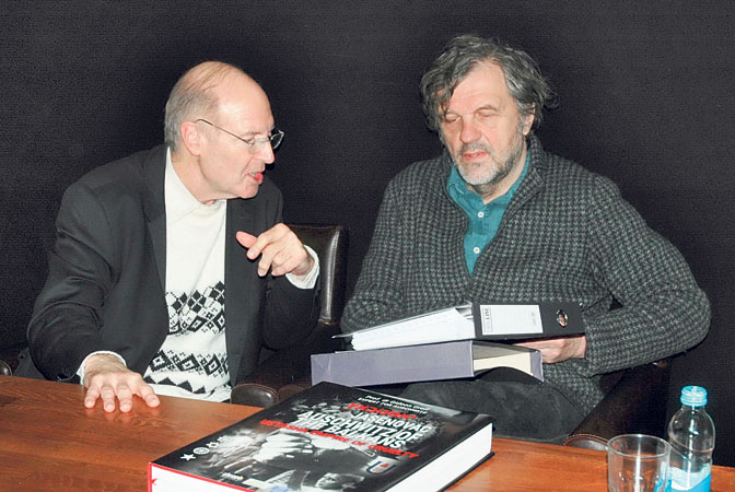 Двојица старих познаника, сарадника и пријатеља, разговарали су непосредно по завршетку трибине на којој је др Грајф исцрпно говорио о резултатима својих истраживања, сабраним у његовој недавно објављеној књизи ,,Јасеновац – Аушвиц Балкана – Усташка империја окрутности”.