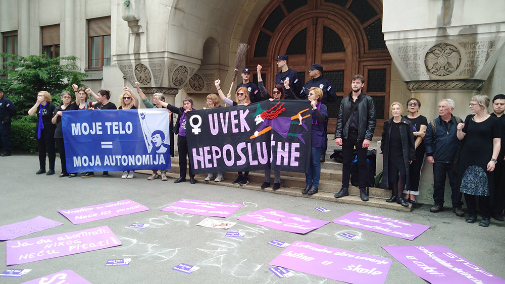 * „Жене у црном“, с још две феминистичке НВО, испред Патријаршије уприличиле су „антиклерикалну феминистичку акцију. Једна постарија жена,на пример, писала је по асфалту: „Моје тело, моја аутономија“, док је млађи мушкарац, костимиран као свештеник, ишао за њом и то брисао. Е баш је моћно! Али,због чега је организован протест испред Патријаршије? Код нас је абортус легалан од 1929. године, а саставни део здравствених услуга, уз тек лични захтев, од 1974. године. Патријаршија није покренула иницијативу да се ту ишта промени, нити је променила (пооштрила) став према том питању. Али, наше „грађанке“ ипак су нашле за сходно да обзнане да је СПЦ за нешто крива