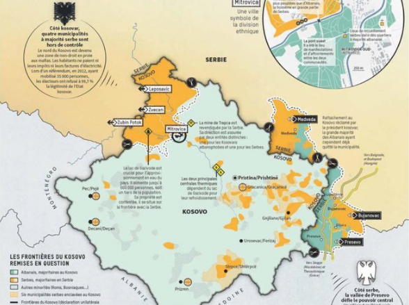 ФРАНЦУСКИ днени лист Le Mond објавио је два текста о евентуалној размени територија између Београда и Приштине, као и мапу Косова са својим тумачењем како би изгледала "измена граница, уз оцену да су "етнички мозаик, кључне инфраструктуре и културна здања препреке за пројекат поновног дефинисања граница".