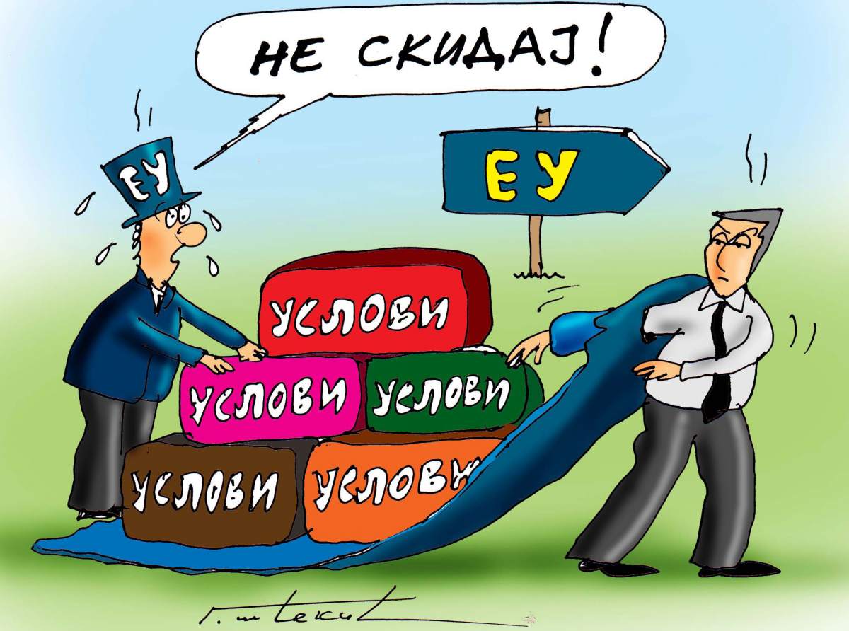 Кад је 2000. године Војислав Коштуница победио Слободана Милошевића на изборима победнички и западнољубиви ДОС је ударао у таламбасе како је – пријем у ЕУ питање године. Унија се смешкала као конкубина која види новог солидног муштерију. Пошто љубав није била обострана, бирократија из Брисела је „досовце“ миловала по коси као мале прљаве кретене које би примила у топли дом, рецимо у шталу на сеник, али извесно не може због смрада и прљавштине коју они не могу да саперу. И Србија се дочепала преговора о приступању Унији 21. јанура 2014.