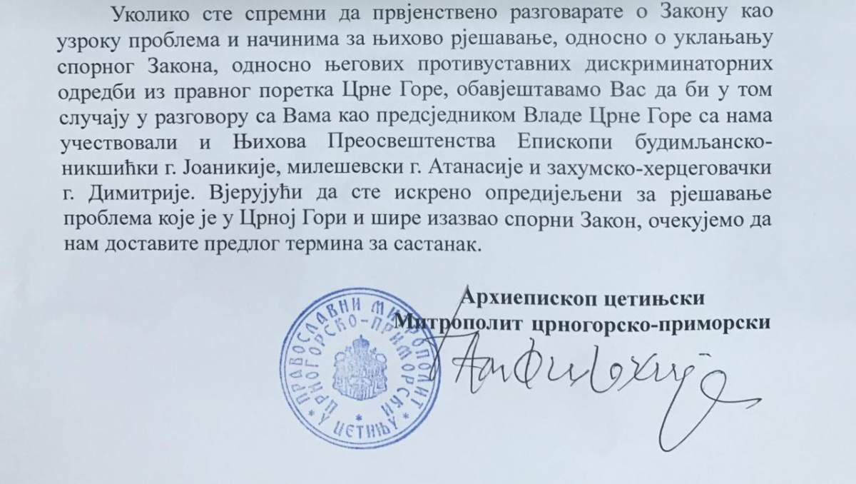 Ипак, свјесни историјског и данашњег значаја трона Светог Петра Цетињскога и наше одговорности као Православног Архиепископа цетињског Митрополита црногорско-приморског и егзарха Најсветијег Трона Пећкога коју смо пред Богом, овим народом и историјом примили од својих свештених претходника, а посве забринути за слогу, мир и јединство повјереног нам православног народа Божјег у Црној Гори, спремни смо да се, имајући у виду одлуке Светог Архијерејског Синода СПЦ и Епископског савјета Српске Православне Цркве у Црној Гори и поштујући Устав Црне Горе, састанемо са Вама са надом да сте искрено опредијељени за коначно отварање суштинског и људског разговора са циљем да се у складу са правним поретком Црне Горе уклони Закон или све дискриминаторне одредбе у њему које су Вама и читавој јавности добро познате како би се повратио мир и спокој међу православне вјернике и све правдољупце у Црној Гори.