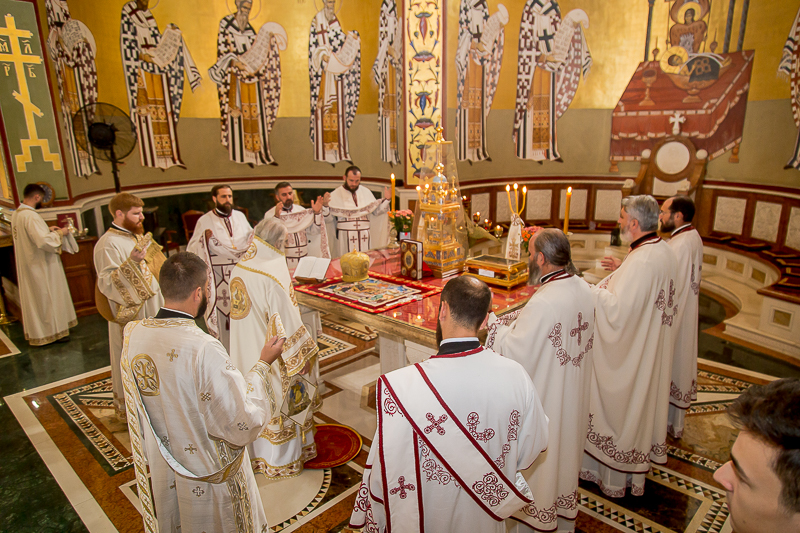 Рекао је да је добро што ову службу у част овога празника празнујемо у храму који су освештали православни патријарси на челу са васељенским патријархом Вартоломејем, нашим патријархом Павлом и московским патријархом Алексијем.