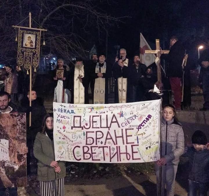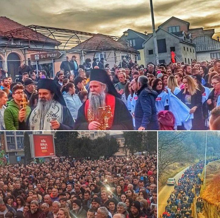 Потом је прочитао проглас које је написало свештенство у једној парохији близу Београда, подсећајући да су и они данас били у крсном ходу за одбрану светиња, што потврђује „колико је народа са нама и како идемо као једна душа и срце“.