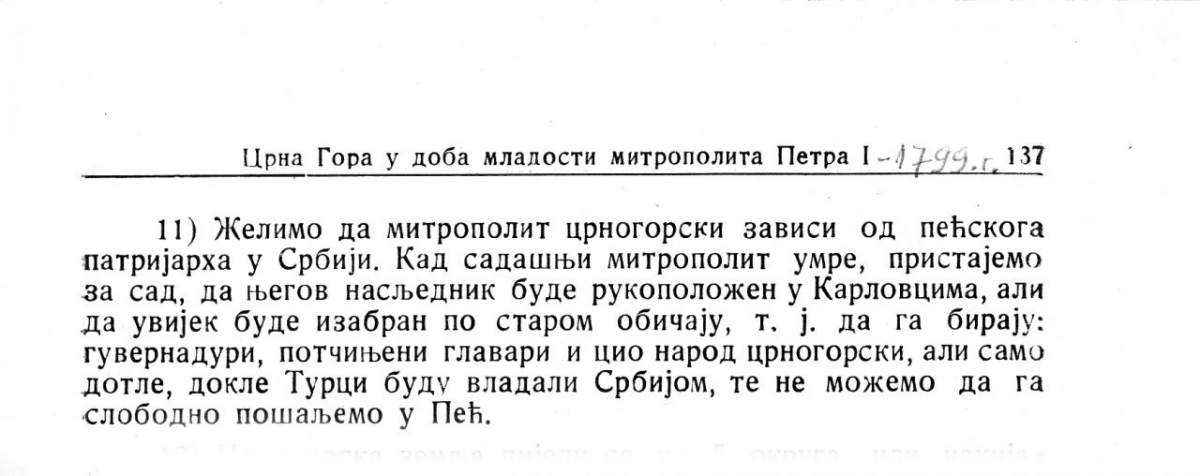 „Желимо да митрополит црногорски зависи од пећског патријарха у Србији. Кад садашњи митрополит умре, пристајемо за сад, да његов насљедник буде рукоположен у Карловцима, али да увијек буде изабран по старом обичају, т. ј. да га бирају: гувернадури потчињени главари и цио народ црногорски, али само дотле, докле Турци буду владали Србијом, те не можемо да га слободно пошаљемо у Пећ.“