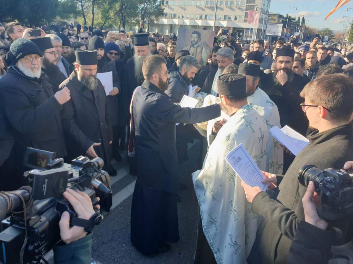 „Наше је да устанемо против неправде, али не оружјем, нити било каквом силом, него само силом истине и правде, са позивом на братску љубав, разумјевање и слогу. Овај наш данашњи окуп је позив и опомена, али прије свега водимо рачуна, да буде достојанствен, као и сви наши досадашњи скупови. Не дај Боже било какав инцидент, ово није страначки скуп, нити било која странка може да организује свештенство. Ово је народни скуп и ми као свештеници заједно смо са својим народом“, поручио је владика Јоникије пред полицијским кордоном.