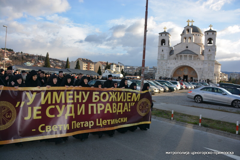 „Свети оци Владике, свештенство наше, монаштво, народе Божји, и сви они који су посланици у овој Скупштини Црне Горе, ево овдје наше сестре монахиње у име мајке Светога Василија, острошкога и тврдошкога чудотворца, Светога Петра Цетињскога и Петра Ловћенског Тајновидца носе овај транспарент на коме су написане оне свете ријечи Петра Првог, Митрополита и Чудотворца цетињског: У имену Божјем је суд и правда.