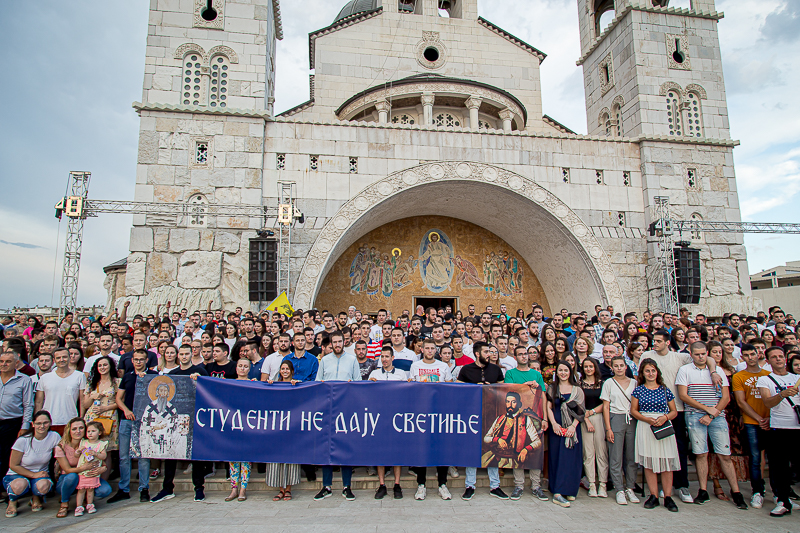 * Молебану су присуствовали и студенти окупљени око “Студентске иницијативе за одбрану светиња”, који су испред храма раширили транспарент на којем пише: “Студенти не дају светиње”. У њихово име, надахнут говор одржао је студент ПМФ-а Небојша Касалица који је рекао: «Хоћемо слободну Црну Гору у којој ће владати право и неће се отимати од Цркве. Слободну Црну Гору у којој се људи неће пребијати на улицама и у кафићима само зато јер су рекли не дамо светиње”