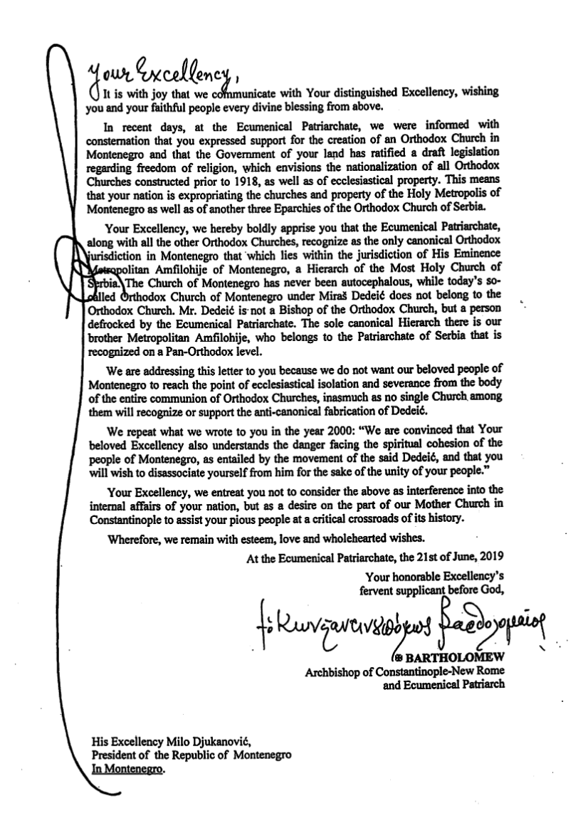Ваша Екселенцијо, овим писмом Вам јасно и потпуно отворено саопштавамо да Васељенска Патријаршија, заједно са свим другим Православним Црквама, као једину канонску православну јурисдикцију у Црној Гори признаје ону под надлежношћу Високопреосвећеног Митрополита црногорског Амфилохија, јерарха Најсветије Цркве Српске.
