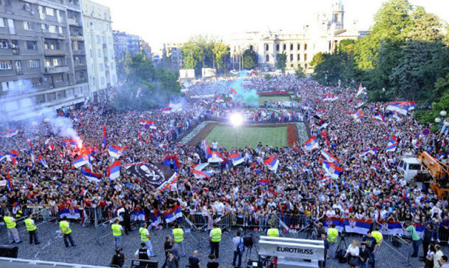 ВИШЕ хиљада људи окупило се вечерас испред Скупштине Београда на дочеку ватерполиста Србије који су у Шпанији освојили четврту узастопну титулу шампиона Европе.