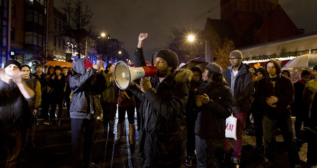 Основна маса демонстраната се приближила седишту њујоршке полиције. Многи са рукама подигнутим увис. Неки су носили транспаренте против расизма, а неки су држали дрвене палице које су држали тако да све личи и на затворске решетке и на ограде. При том су скандирали: „Овако изгледа демократија”.