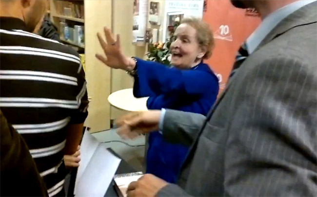 Организатори су безуспешно покушавали да отерају активисте, а њихова упорност на крају је испровоцирала и саму Олбрајтову која је устала и почела да виче „Напоље, напоље”!