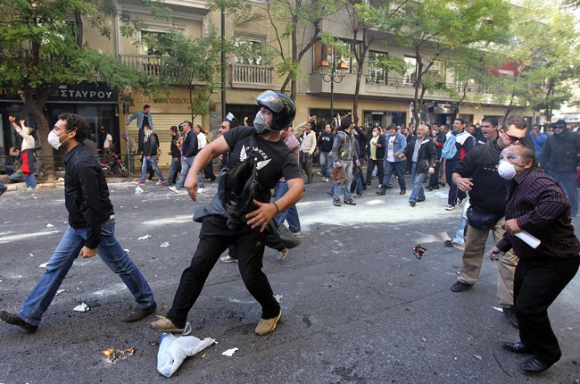 Групе анархиста су се на тргу Синтагми појавиле обучене у црно, са марамама преко лица, неки и са гас-маскама. Праве мале битке са полицијом приредили су на степеницама пред парламентом и поред споменика Незнаном јунаку