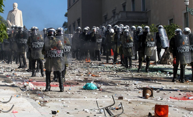 Иако се сматра „градом демонстрација”, Атину овакви протести нису потресали последњих година. Демонстранти су на улице изашли са транспарентима „Доле лоповске мере”, „Доле влада и власт плутократије”, „Лопови”.