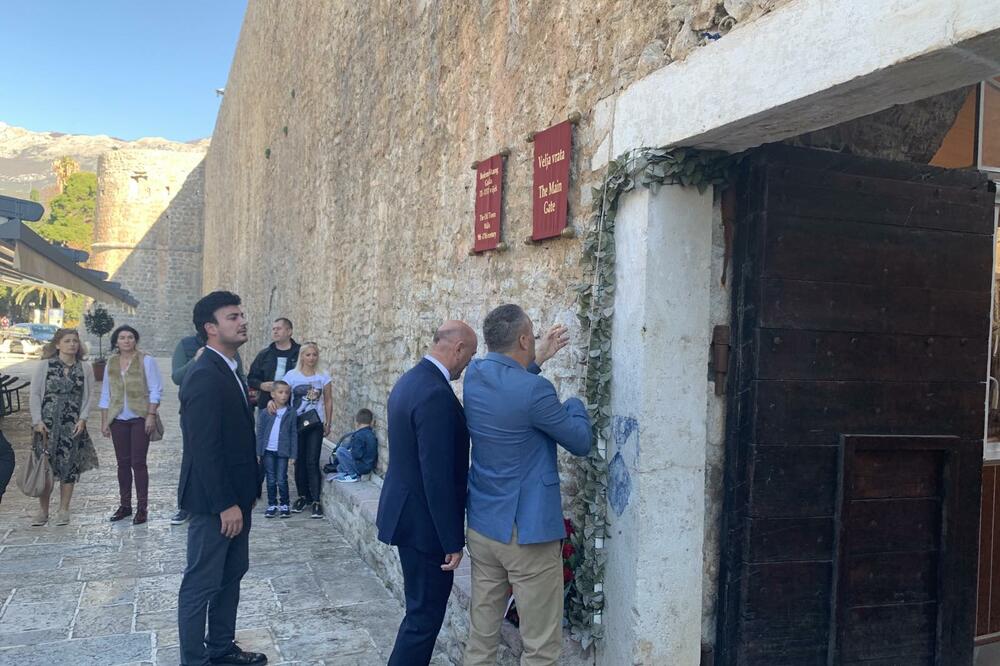На табли, која је изнад главних врата у Стари град постављена 1931. пише: "На успомену доласка храбре побједоносне Српске војске која послије јуначких побједа ослободи Будву, на Митровдан 8. новембра 1918. поставља Општина Будва".
