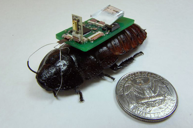 Лу Гуангје са универзитета Ђаотонг уградио је живим бубашвабама микроелектроде које стимулишу одређене нерве у антенама инсекта.