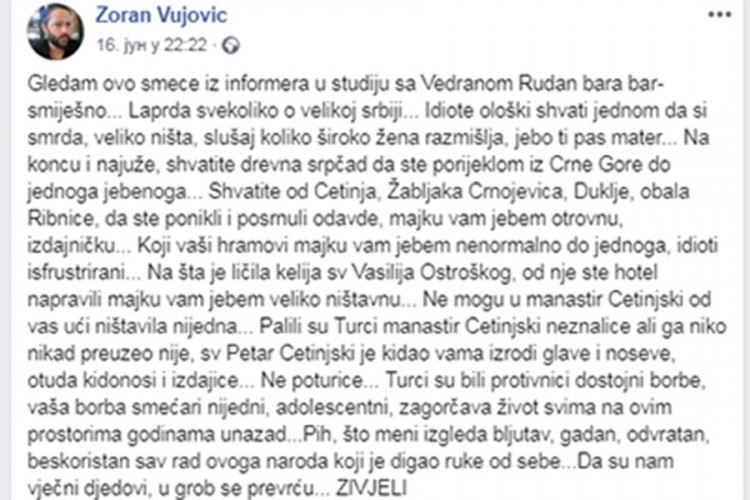 Који ваши храмови мајку вам јебем ненормално до једнога, идиоти исфрустрирани. На шта је личила св. Василија Острошког, од ње сте хотел направили мајку вам јебем велико ништавну. Не могу у манастир Цетињски од вас ући ништавила ниједна. Палили су Турци манастир Цетињски незналице али га нико никад преузео није, св. Петар Цетињски је кидао вама изроди главе и носеве отуда кидоноси и издајице... Не потурице. Турци су били противници достојни борбе, ваша борба смећари ниједни, адосцелентни, загорчава живот свима на овим просторима годинама уназад. Пих, што мени изгледа бљутав, гадан, одвратам, бескористан сав рад овога народа који је дигао рекао од себе... Да су нам вјечни дједови, у гроб се преврћу. Живјели", написао је Вујовић у својој објави.