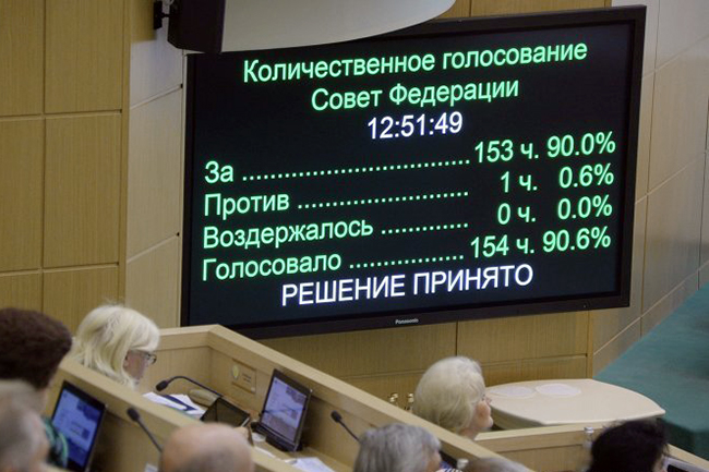 Према члану 102. Устава РФ, одлучивање о коришћењу Оружаних снага земље изва њених граница - у искључивој је надлежности Савета Федерације, а таква одлука је пуноважна уколико за њу гласа већина, односно - најмање 85 сенатора.
