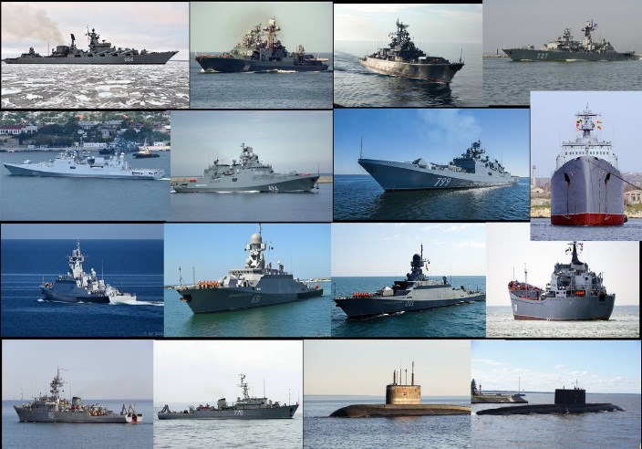 * У „сиријској ескадри“ су: ракетна крстарица „Маршал Устинов“, велики противподморнички број „Североморск“, патролни брод „Питљивиј“, фрегате „Адмирал Григорович“, „Адмирал Есен“ и „Адмирал Макаров“, мали ракетни бродови велике ударне моћи „Град Свијажск“, „Велики Устјуг“ и «Вишњиј Волочок“ (име једног брода се не наводи) и дизел-електричне подморнице Б-268 „Велики Новгород“ и Б-271 „Колпино“