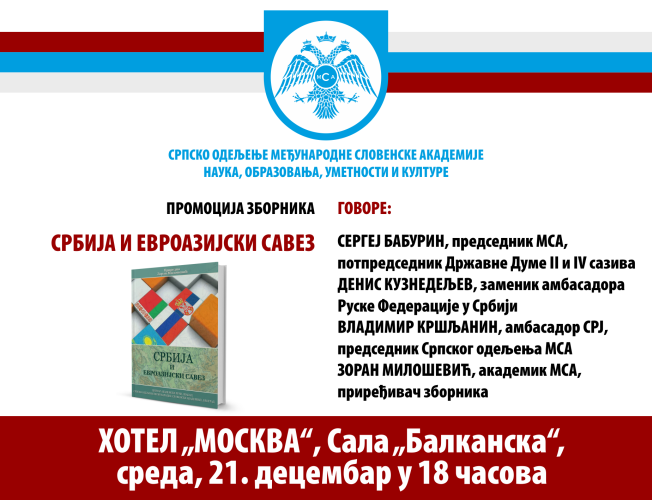 СРПСКО одељење Међународне словенске академије наука, образовања, уметности и културе органзује у београдском хотелу „Москва” промоцију књиге „Србија и Евроазијски савез”.
