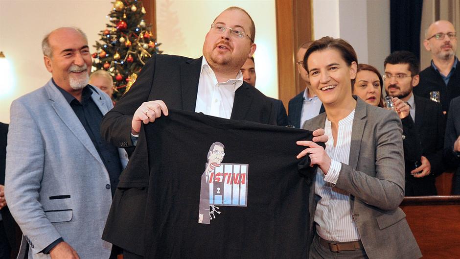 "Задовољна сам и поносна слободом медија и нивоом демократије у Србији", казала је Ана Бранбић на пријему у Влади Србије организованом уочи празника на којем јој је карикатуриста Марко Сомборац поклонио мајицу са ликом председника Србије Александра Вучића и натписом "Истина".