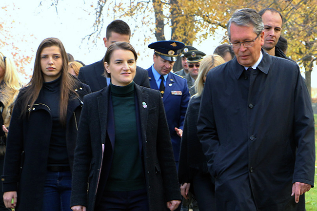 „И у Првом и у Другом светском рату Србија се борила раме уз раме са свим слободољубивим земљама. Наша политика није се ни до данас променила. Пријатељство и сарадњу негујемо и са Истоком и са Западом - Руском Федерацијом, земљама ЕУ, САД, Кином, Индијом, Уједињеним Арапским Емиратима, земљама Јужне Америке и Азије” рекла је Брнабић.