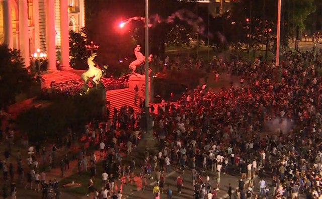 По наводима портала Нова.рс, група од око 200 демонстраната оборила ограду испред зграде скупштине и попела се на степенице парламента.