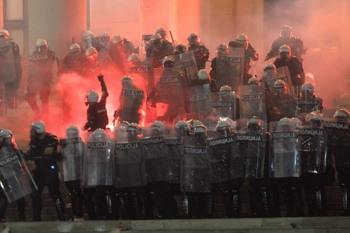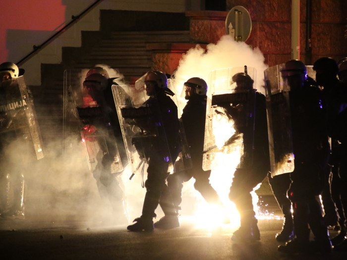 Министар унутрашњих послова Србије Небојша Стефановић рекао је да се испред Скупштине дешавају бруталне сцене насиља и да је полиција морала да реагује како би заштитила јавни ред и мир и имовину.