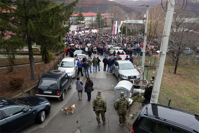Мирни протест Срба са севера Косова због дискриминаторске одлуке Приштине о увођењу таксе од 100 одсто на робу из Србије одржан је испред седишта Еулекса у северној Косовској Митровици.