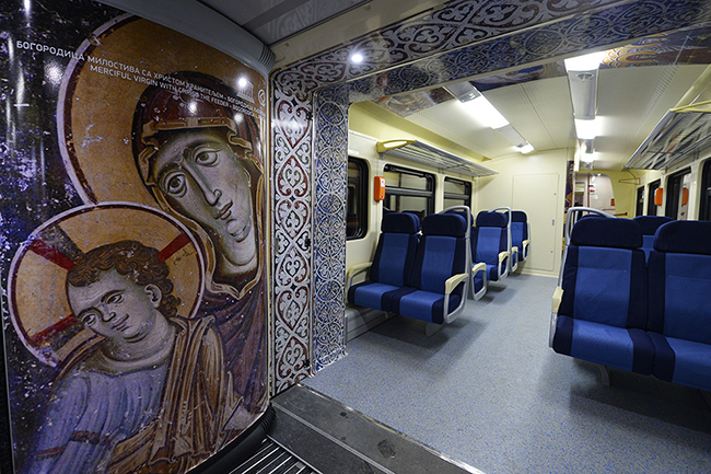 Унутрашњост воза облепљена је сликама фрески и другог српског наслеђа на Косову, које је део Унеска, а тај концепт осмислио је уметник Андреја Васиљевић.