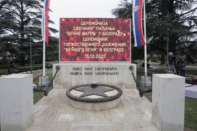 "Не прихватамо покушаје ревидирања историје и данашњи догађај је важна потврда тога", рекао је Лавров на церемонији на којој је упаљена ватру на споменику у Београду.