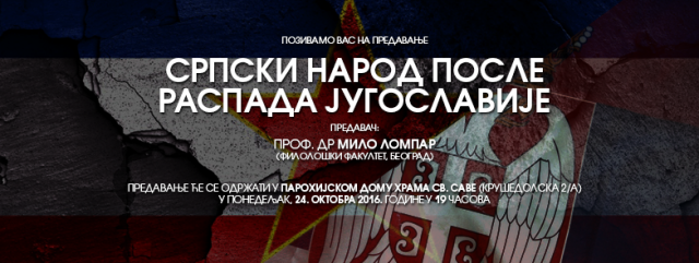 „СРПСКИ народ после распада Југославије“ - ово је тема предавања у великој сали парохијског дома Храма Св. Саве (Крушедолска 2/А) које ће бити одржано у понедељак, 24. октобра 2016. године, у 19 часова.