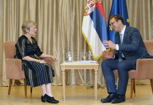 Вучић је, како је саопштено, захвалио за улогу KFOR као гаранта безбедности Срба на Косову, и замолио званичницу NATO да пренесе поздраве Столтенбергу, за кога је рекао да „својим одмереним изјавама показује разумевање за позицију Србије и њене виталне интересе“.