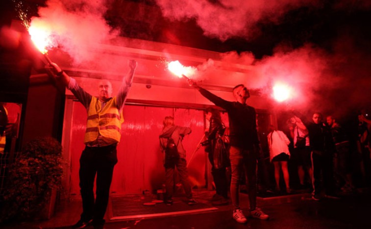 Учесници протеста "Један од пет милиона" у Београду обојили су улазна врата Радио-телевизије Србије (РТС) у ружичасто.