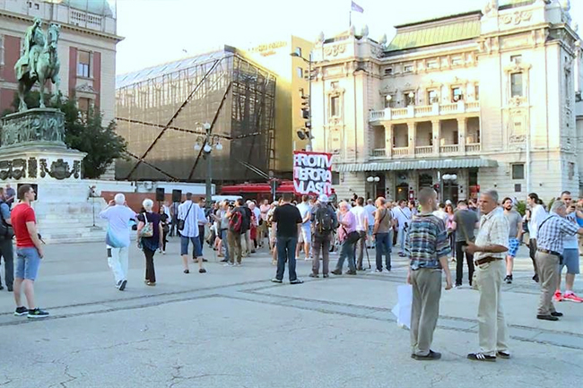 Око 100 људи се окупило на Тргу Републике, од којих су неки носили транспаренте "Оставка", "Против лажне инаугурације", "Улица господара Вучића", "Слобода медија", као и државне заставе.