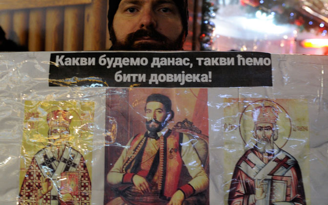 * Учесници протеста су скандирали: „Не дамо вам светиње”. А кад су се упутили ка зградама Председништва, Владе Србије и Храму Светог Саве на челу колоне био је транспарент „Земаљска су кратка царства, небеска трају довека”