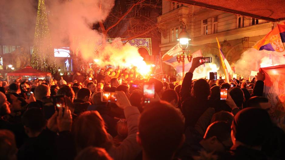 У једном моменту из масе демонстраната, изашла је група с маскама и испалила ватромет изнад амбасаде, док је друга група учесника протеста узвикивала „излазите напоље”.