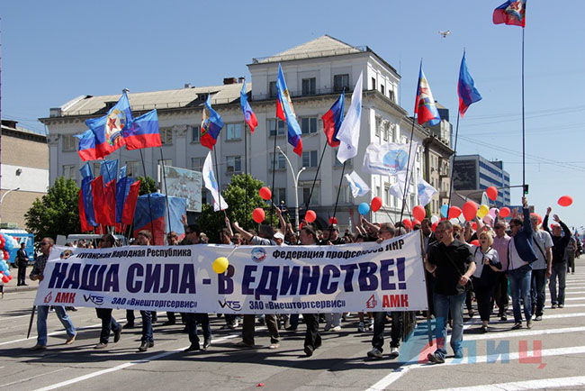 Јуче је, уз присуство Леонида Пасечника и целог државног врха ЛНР на свечаној трибини, по сунчаном дану, у Луганску одржана досад највећа првомајска парада, са преко 30.000 учесника – радних колектива, студената, ученика, културних посленика, војске, полиције и козака, манифестујући у најсвечанијем духу, и политичко јединство и резултате у изградњи привредног, државног и друштвеног живота.