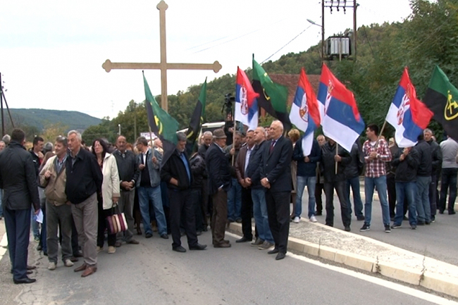 Саобраћај је блокиран камионом, аутобусом и путничким аутомобилима, а на лицу места налази се неколико десетина Срба.