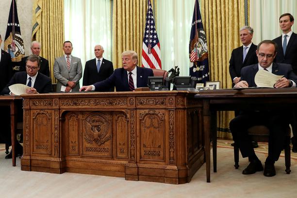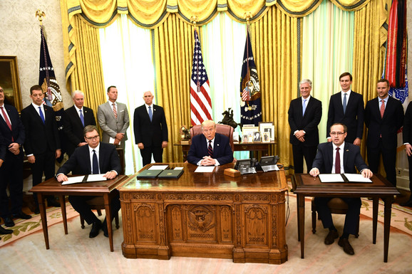 Трамп је поздравио храброст Вучића и Хотија у финализовању споразума о нормализацији економских односа, чиме су како је рекао учинили "своје земље, Балкан и свет безбеднијим".
