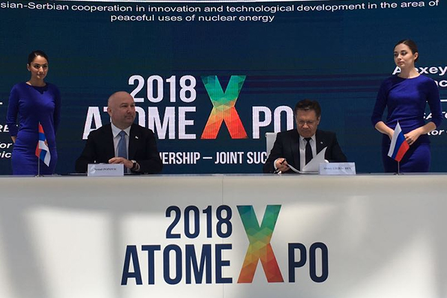 МИНИСТАР за иновације и технолошки развој Ненад Поповић и генерални директор Државне корпорације за нуклеарну енергију „Росатом“ Алексеј Лихачов потписали су документ о принципима руско-српске сарадње у области иновација и технолошког развоја у подручју примене нуклеарне енергије у мирне сврхе.