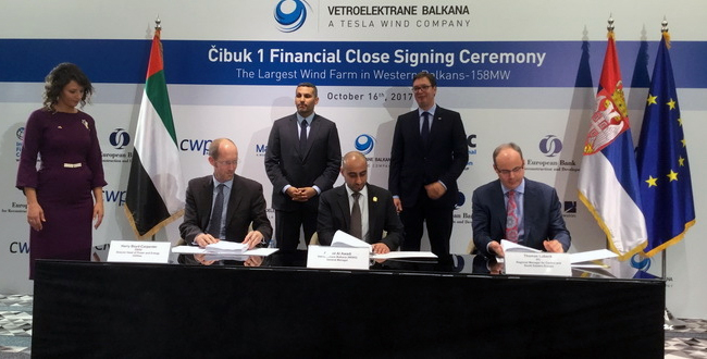 Кредитна линија потписана је између компаније Ветроелектране Балкана Д.О.О Београд и Међународне финансијске корпорације (IFC) и Европске банке за обнову и развој (EBRD), прецизирано је у саопштењу.