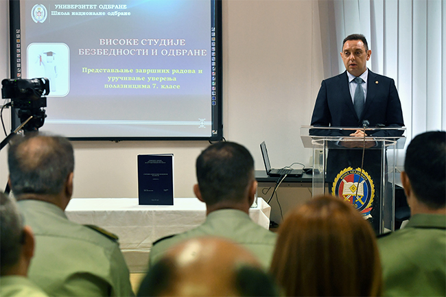 МИНИСТАР одбране Александар Вулин уручио је сведочанства о успешно завршеном усавршавању полазницима седме класе Високих студија безбедности и одбране, што је највиши ниво усавршавања у систему војног школства.