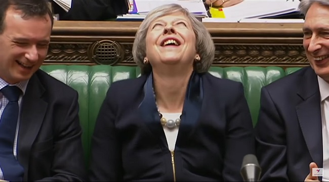 Смех од којег јој је подрхтвало цело тело „задесио” је Меј док је у Дому општина британског парламента наступао лидер Лабуристичке партије Џереми Корбин. Тачније, у моменту када ју је он оптуживао да је направила „пристрасни аранжман” са грофовијом Суреј.