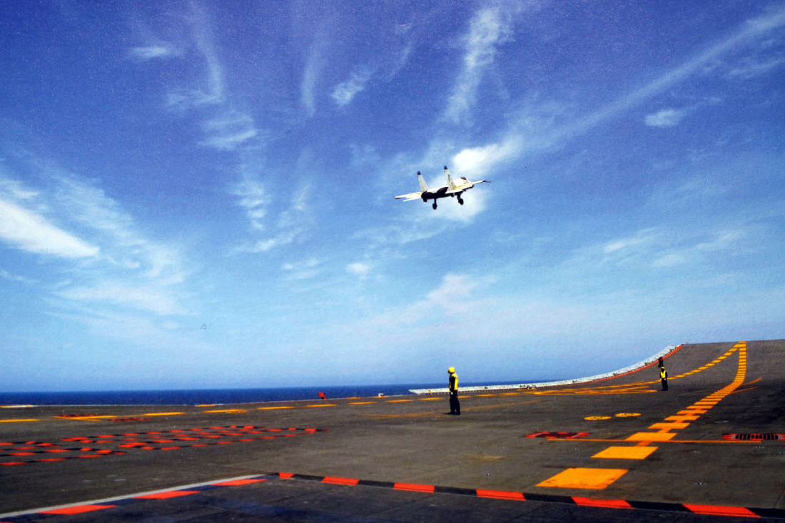 На сајту кинеског министарства одбране објављене су фотографије полетања авиона са носача и слетања на носач.